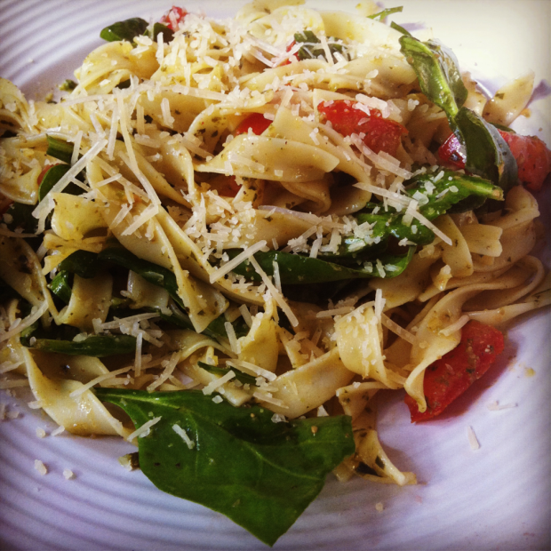 Super easy pasta dinner. Pasta with some basil olive oil, pesto, spinach and tomatoes with some sea salt and freshly grated pepper and just a bit of Parmesan cheese.