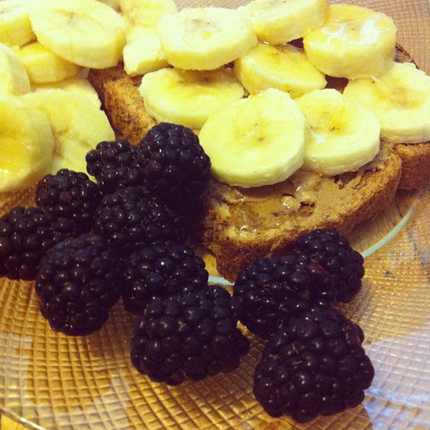 Grab some whole wheat whole grain toast, smother with almond butter (or your favorite nut butter), top with bananas, drizzle with honey. Serve with fresh berries.