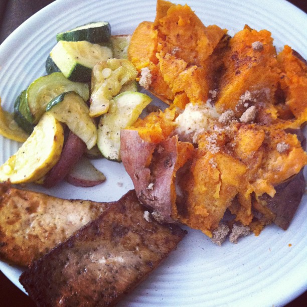 Dinner tonight: Roasted zucchini and yellow squash, baked tofu and baked sweet potato with vegan butter, cinnamon and a bit of brown sugar. Yea, it was hot out and I put on the oven. Luckily this only took about 30 minutes to make!