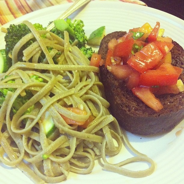 Spinach Fettucine w/broccoli, zucchini, tomato & Bruschetta Previous Next Published October 18, 2012 at 612 × 612 in Spinach Fettucine w/broccoli, zucchini, tomato & Bruschetta