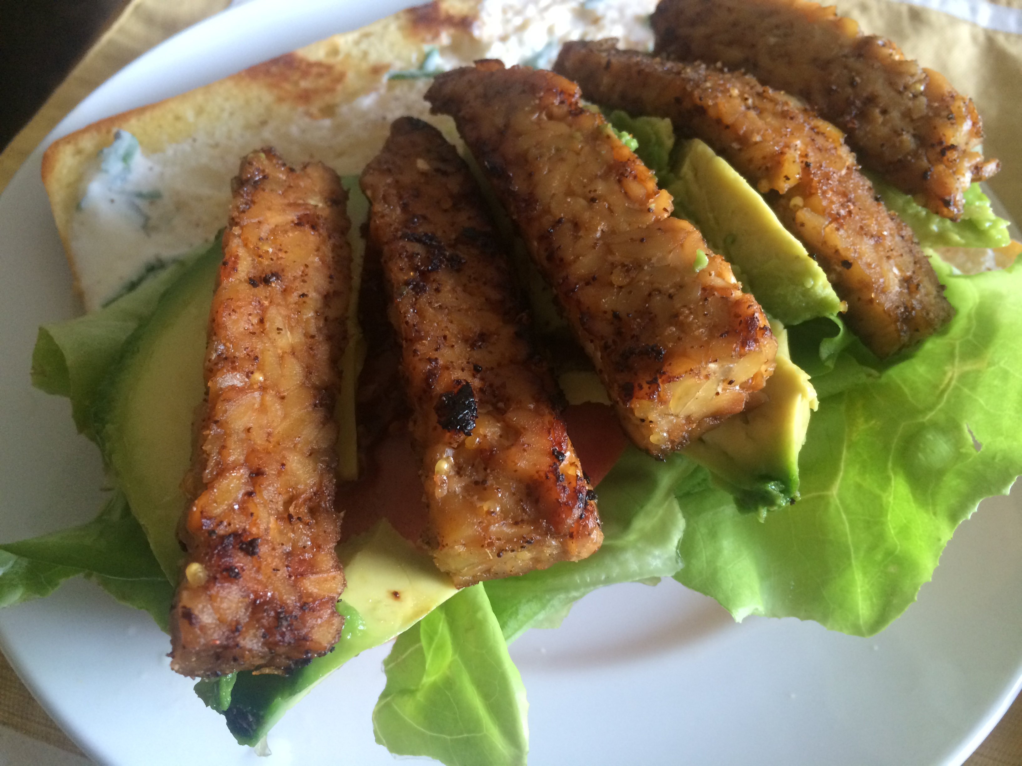 - Assemble your beautiful TBLTA! Add lettuce to the bottom, then tomato, then tempeh then avocado.