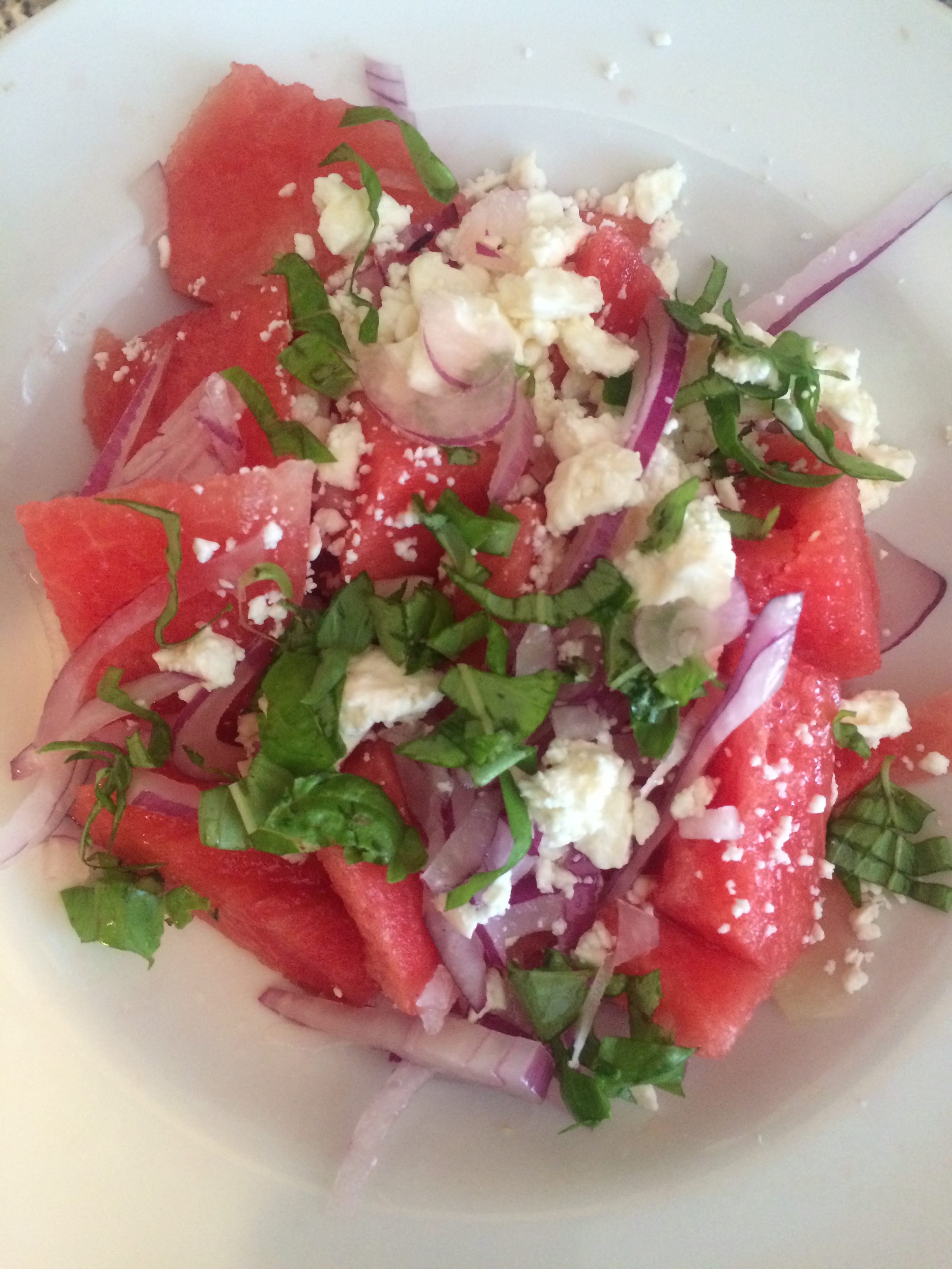 This year not only did I grill pineapple and make my famous guac, I decided to bring out the big guns and wow them with a different way to enjoy watermelon. Savory, tangy, mouthwatering and absolutely hydrating, this salad was one of those that made people go “Hmmm. This is so good.” And that’s the reaction I go for. If you buy one of those big watermelons from the market and decide to cut it up, pop it in this salad. I kid you not, you will enjoy watermelon in a new and loving way.