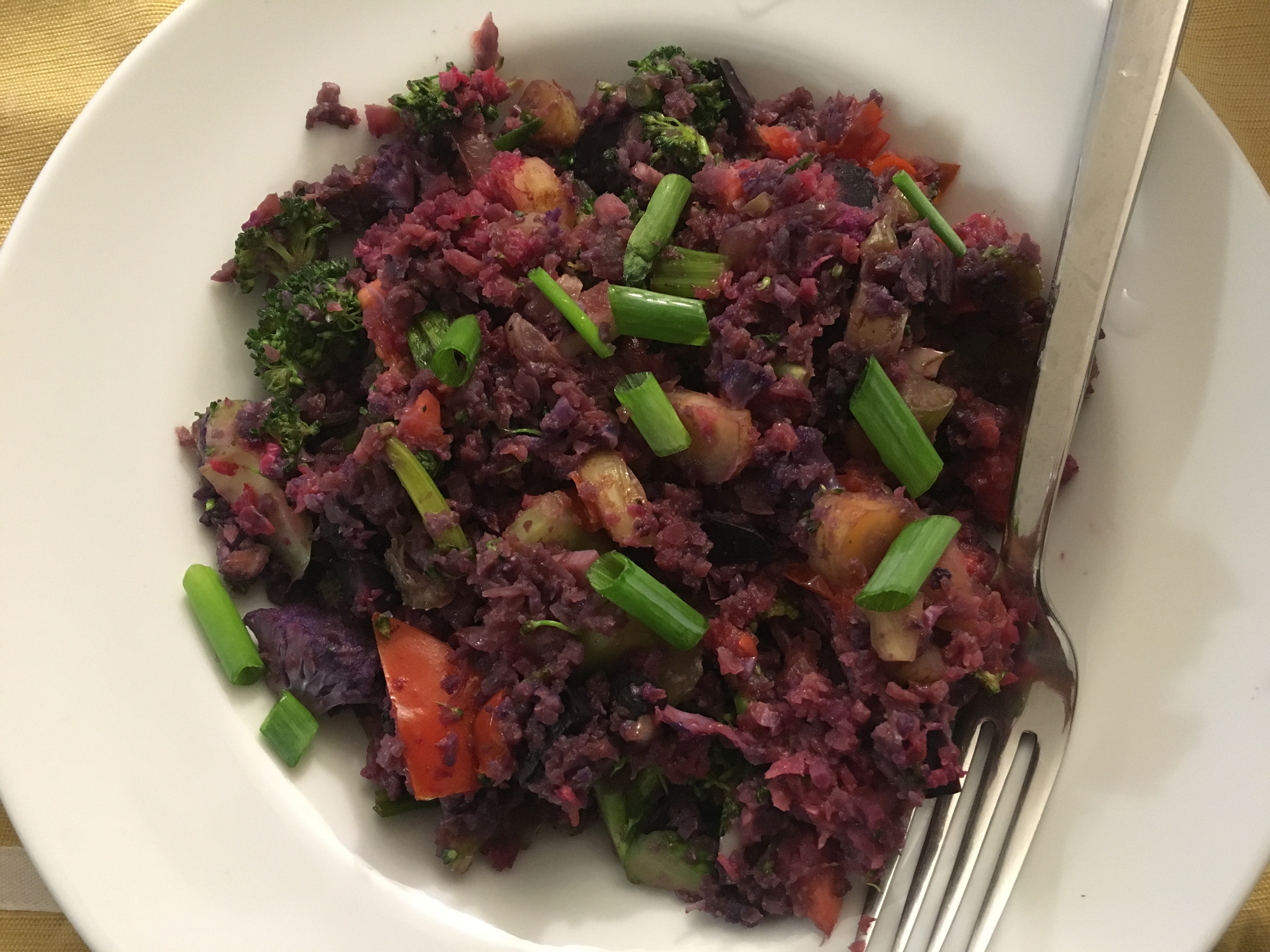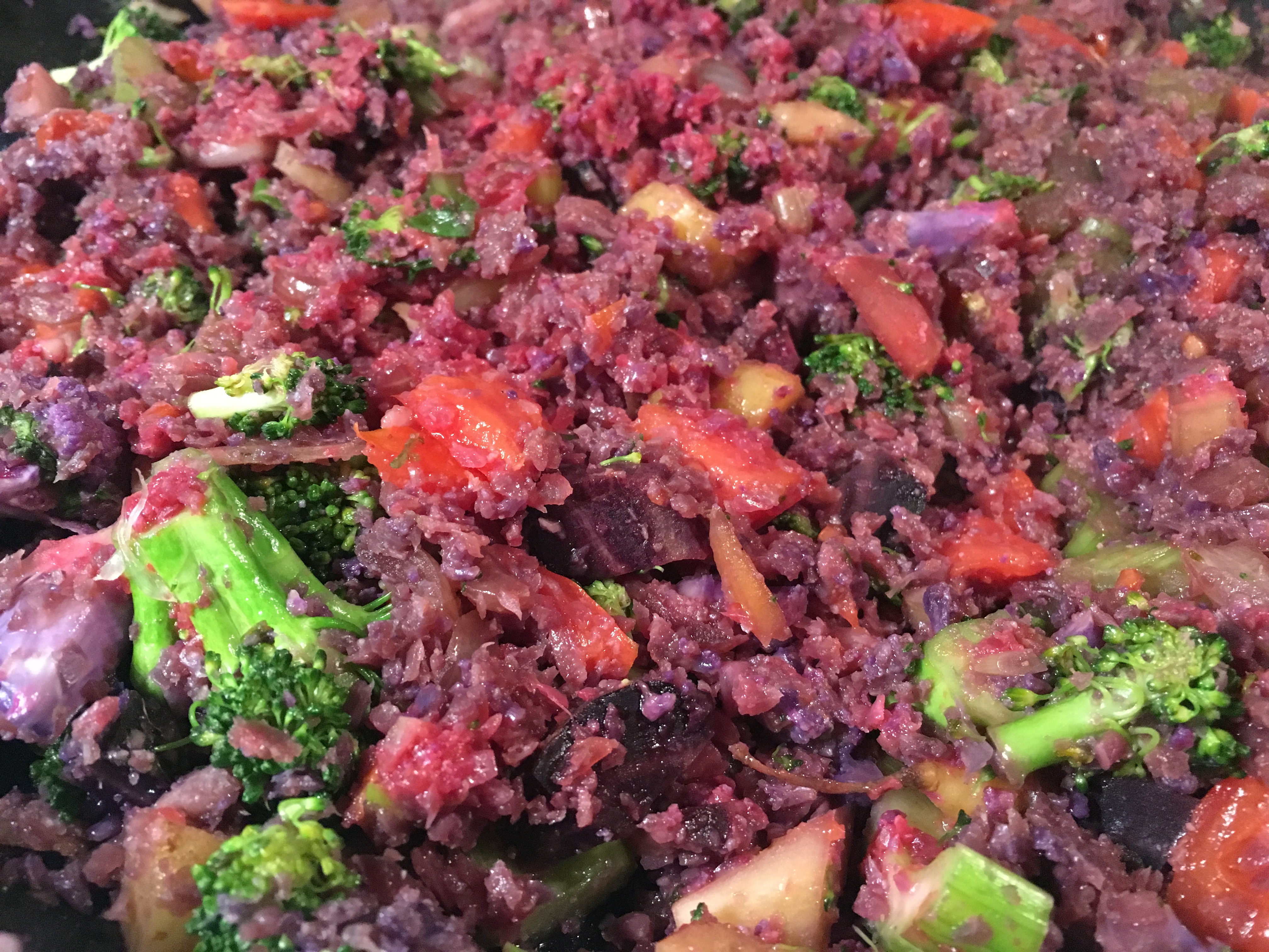 Last week I got my hands on…purple cauliflower. I mean it’s just absolutely stunning. It’s a vibrant purple that begs to be eaten but in an elegant way. There’s no way this should become a puree, it begs to become something more. It has potential. And the night I realized I didn’t have rice in the house, the purple cauliflower became…rice.