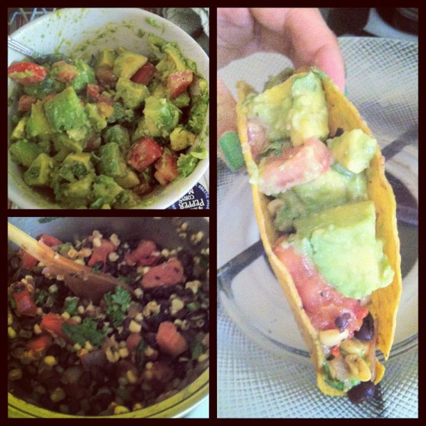 August 1, 2012January 8, 2014Leave a comment Vegan Tacos: Black Beans & Roasted Corn with tomatoes, onion, garlic, cilantro, lime juice, cumin, chili powder. Served with an avocado, tomato, jalapeno salad with cilantro and lime juice. Share this: Click to share on X (Opens in new window) X Click to share on Facebook (Opens in new window) Facebook Click to share on Pinterest (Opens in new window) Pinterest Click to email a link to a friend (Opens in new window) Email Like Loading...